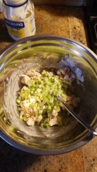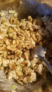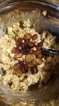 Chicken salad with grapes, walnuts, and celery.. made from the leftover roast chicken dinner! Toss together all ingredients in a large bowl until combined well.