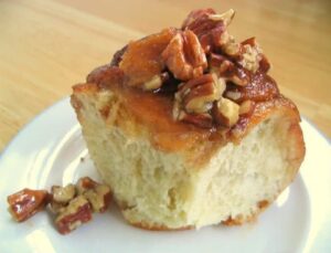 11. Prepare the topping as the buns cool. Heat butter, brown sugar, honey, and salt in a small sauce pan over medium heat whisking occasionally until bubbly. Then off heat, stir in vanilla and toasted chopped pecans. Spoon a dollop over each bun and serve.